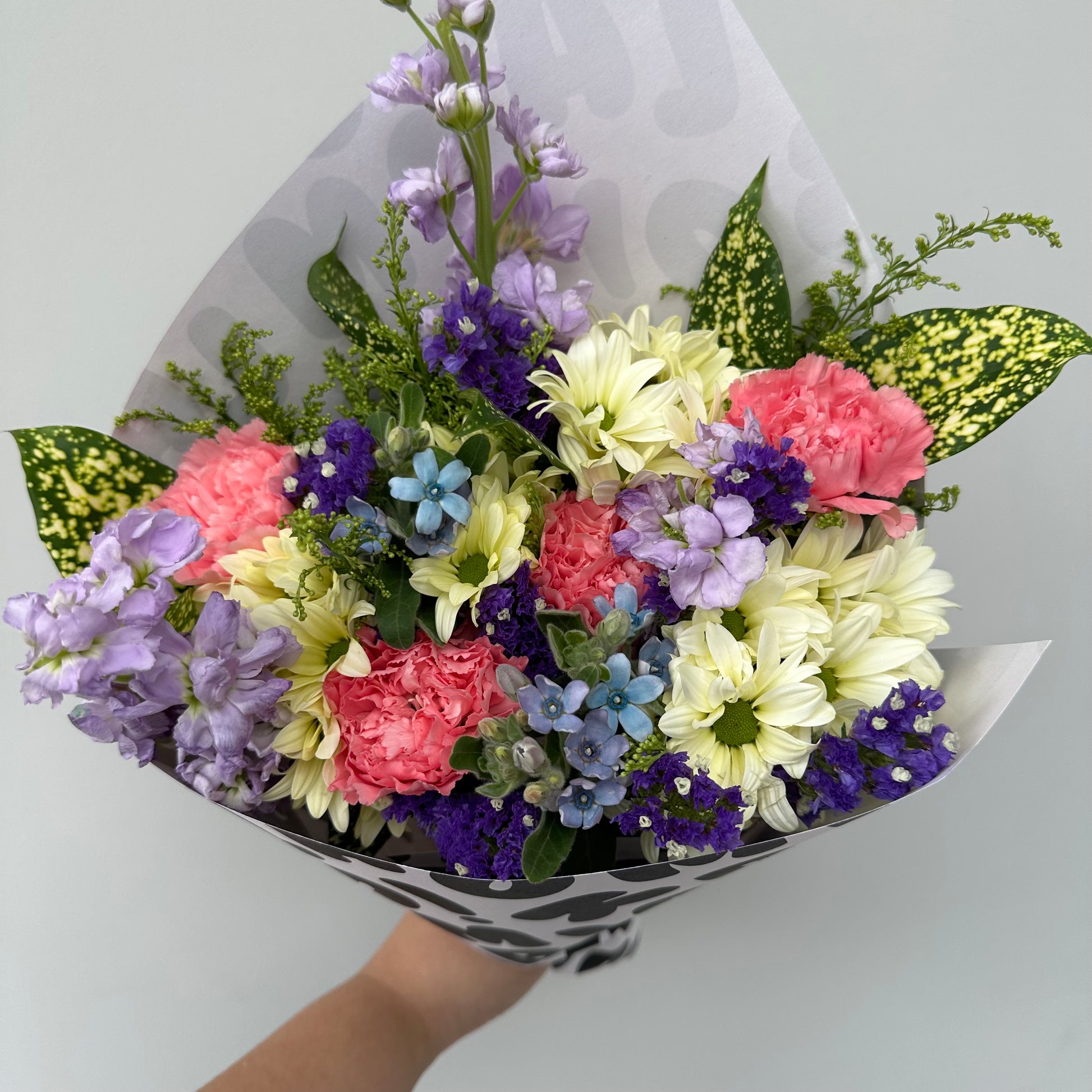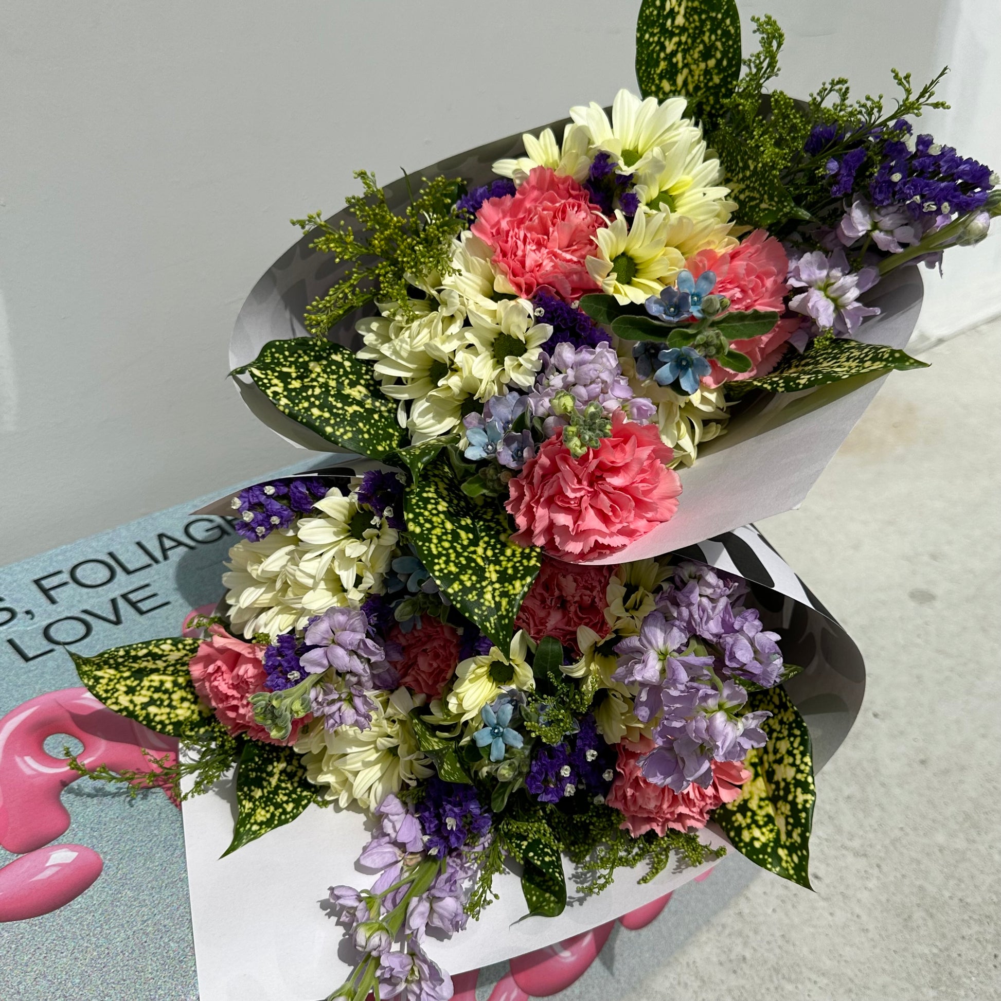 KB ISSUE #28 will run from 9th to 15th December. Carnations, Matthiolas, Statice, Chrysanthemums, and more, fill this garden-like arrangement.