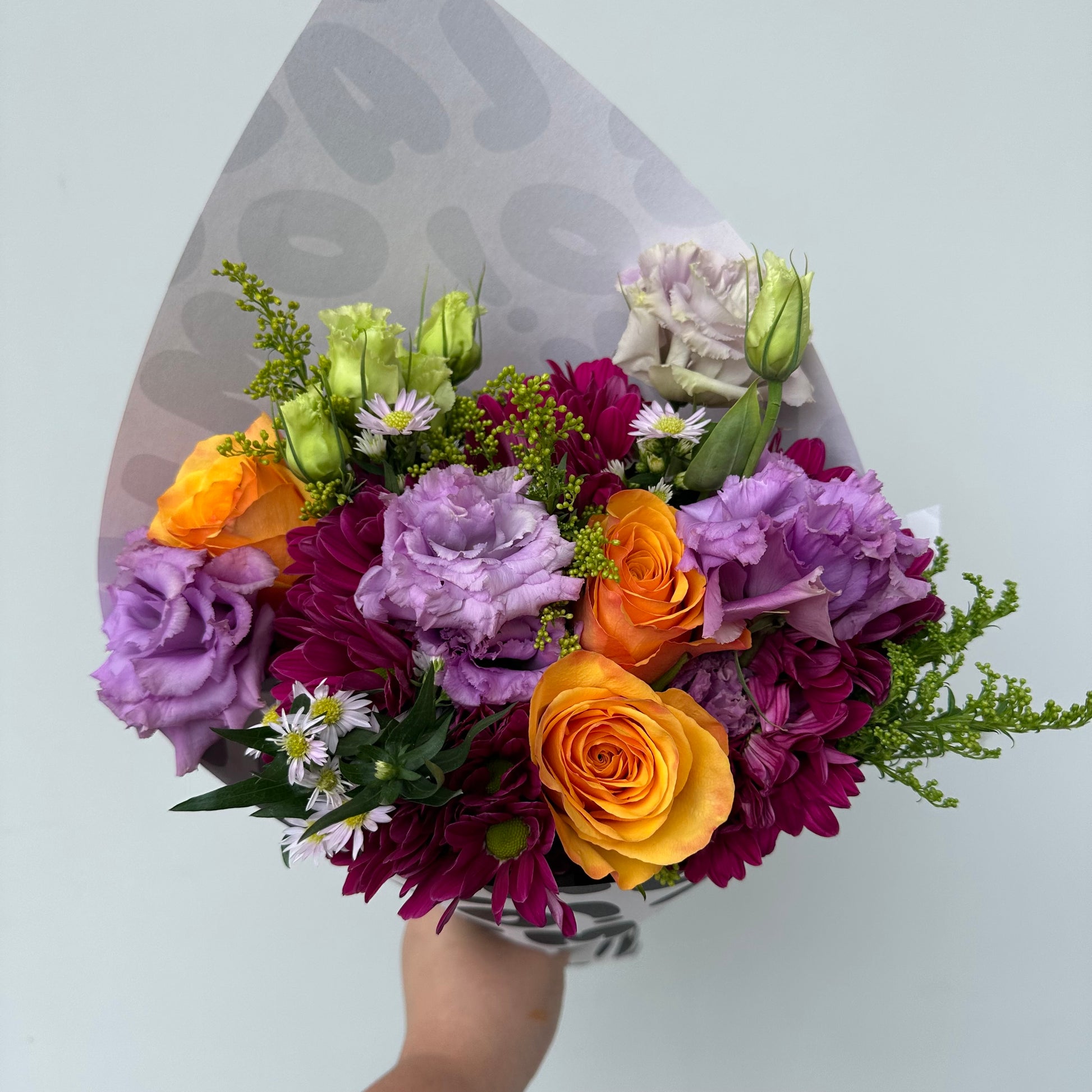 KB ISSUE #32 is here! A lovely mix of purples and oranges, this arrangement consists of Lilac Eustomas, Orange Roses, Purple Chrysanthemums, amongst other blooms.