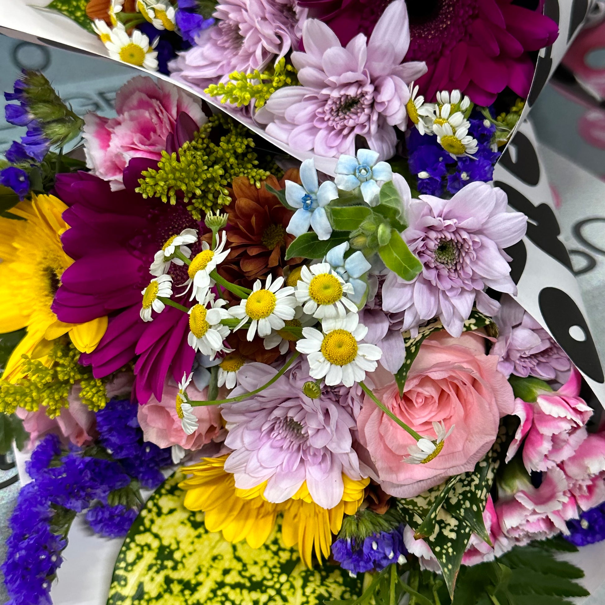 This week, we’re serving up a Technicolor floral explosion—chrysanthemums, light pink roses, oxypetalums, daisies, statice, Japanese bamboo, carnation sprays, and a little extra razzle-dazzle for good measure.