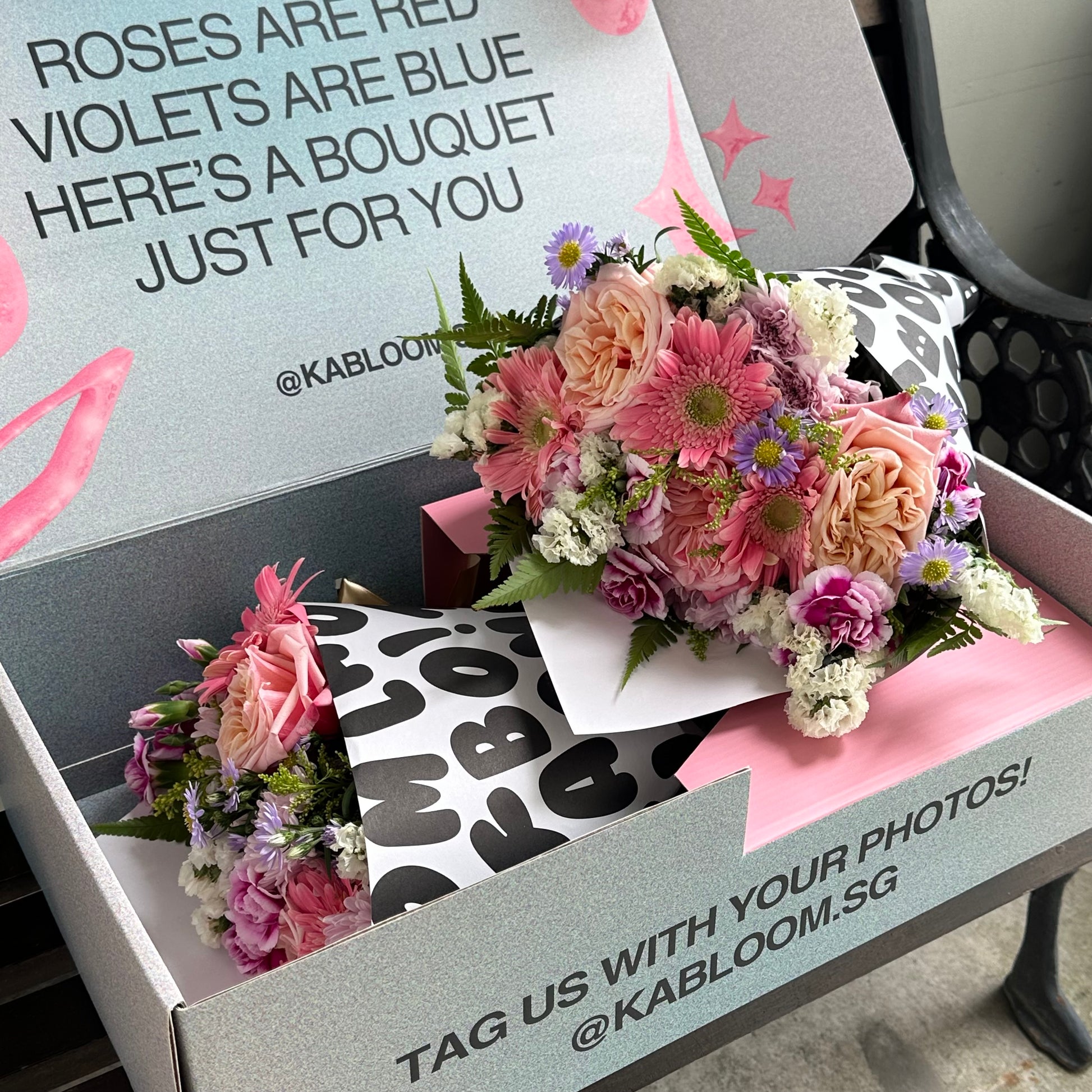 All bouquets will be delivered in our Kabloom boxes, to you or your recipient's doorstep. Each bouquet will also come with a complimentary gift card, please remember to leave your note and delivery date (!!!!) before you check out!