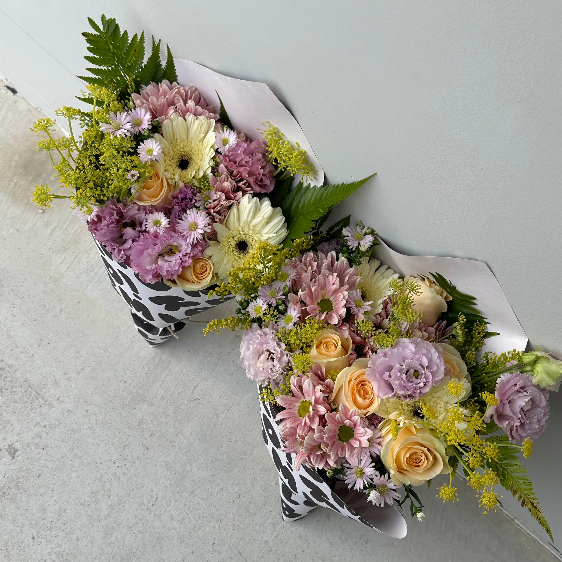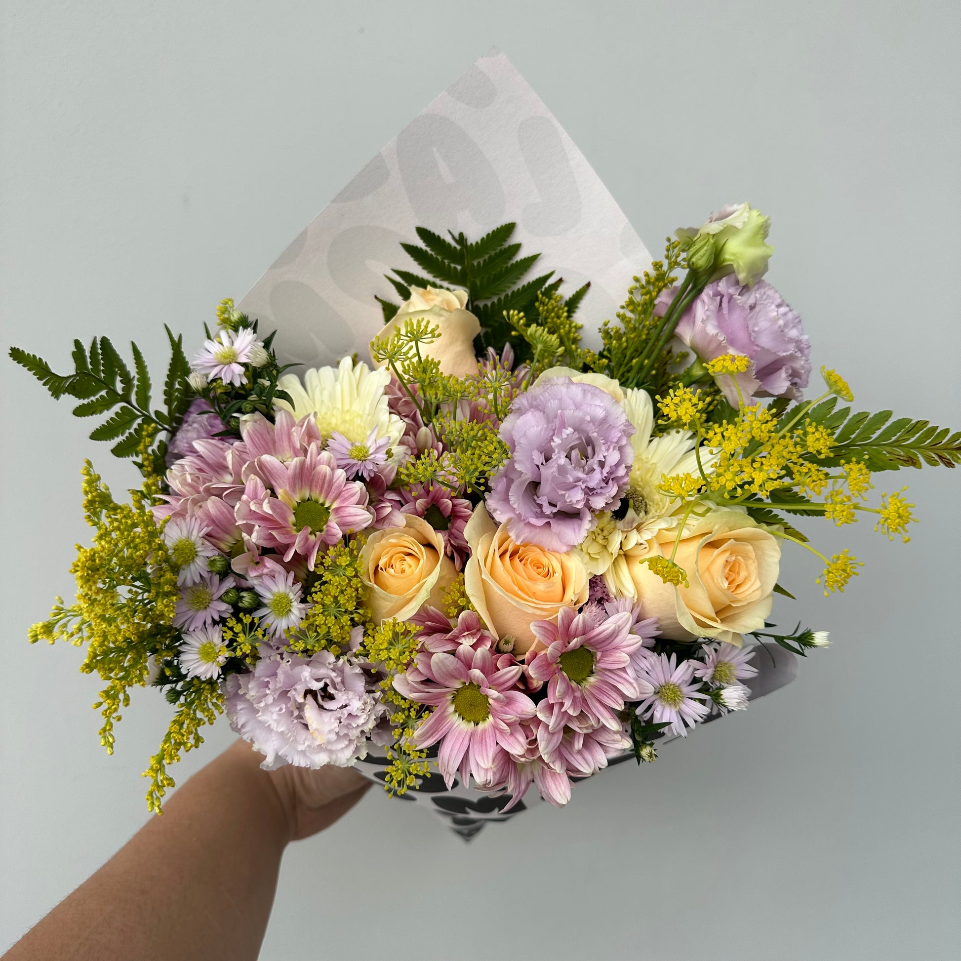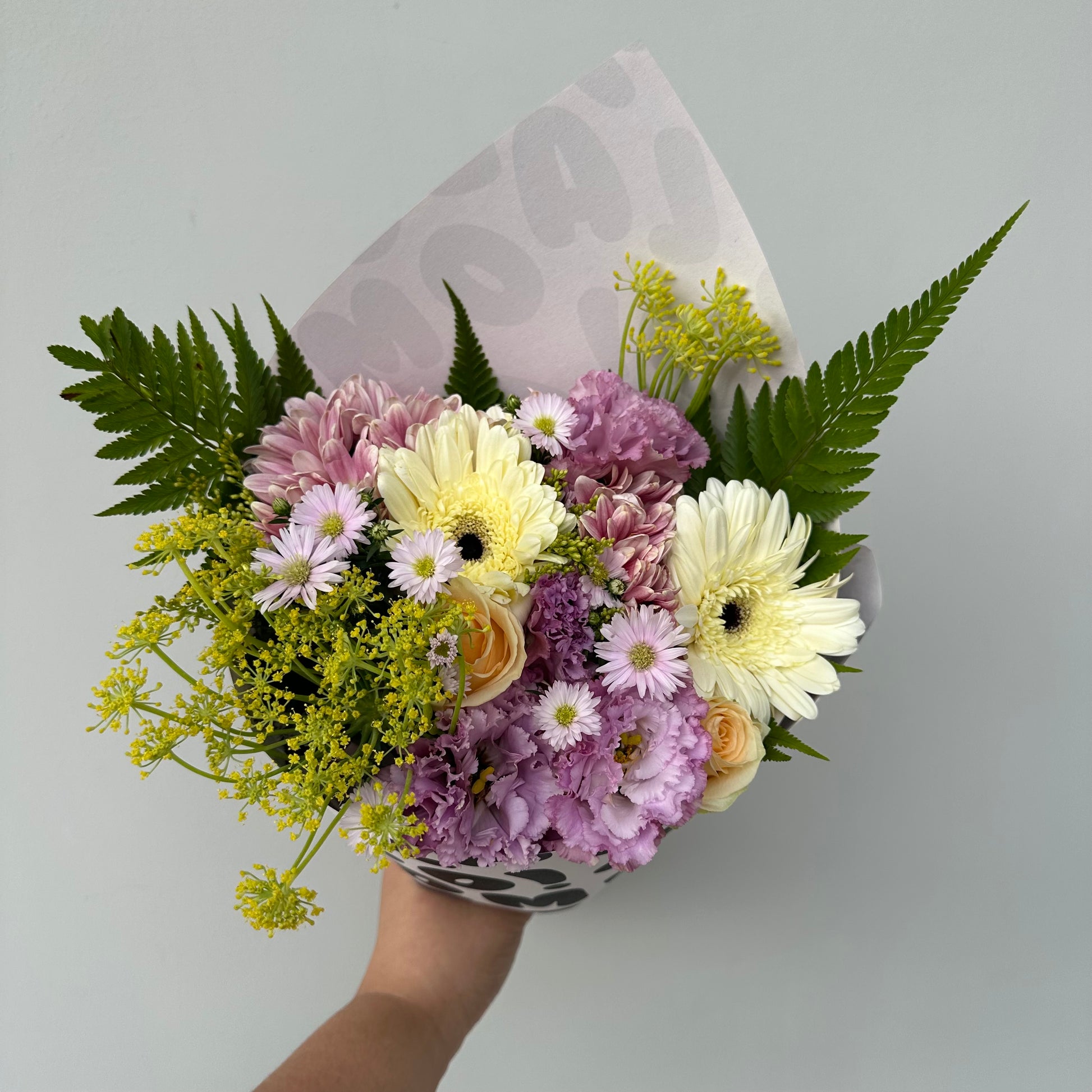 This arrangement is your floral equivalent of soft lighting, chill vibes, and a clean girl playlist on loop. Featuring Champagne roses, Lilac Eustomas, Lilac Daisies, White Gerberas, Anethum, and champagne chrysanthemums (plus some surprise blooms—we’re fun like that), this mix brings fluff, calm, and just the right amount of pretty chaos.