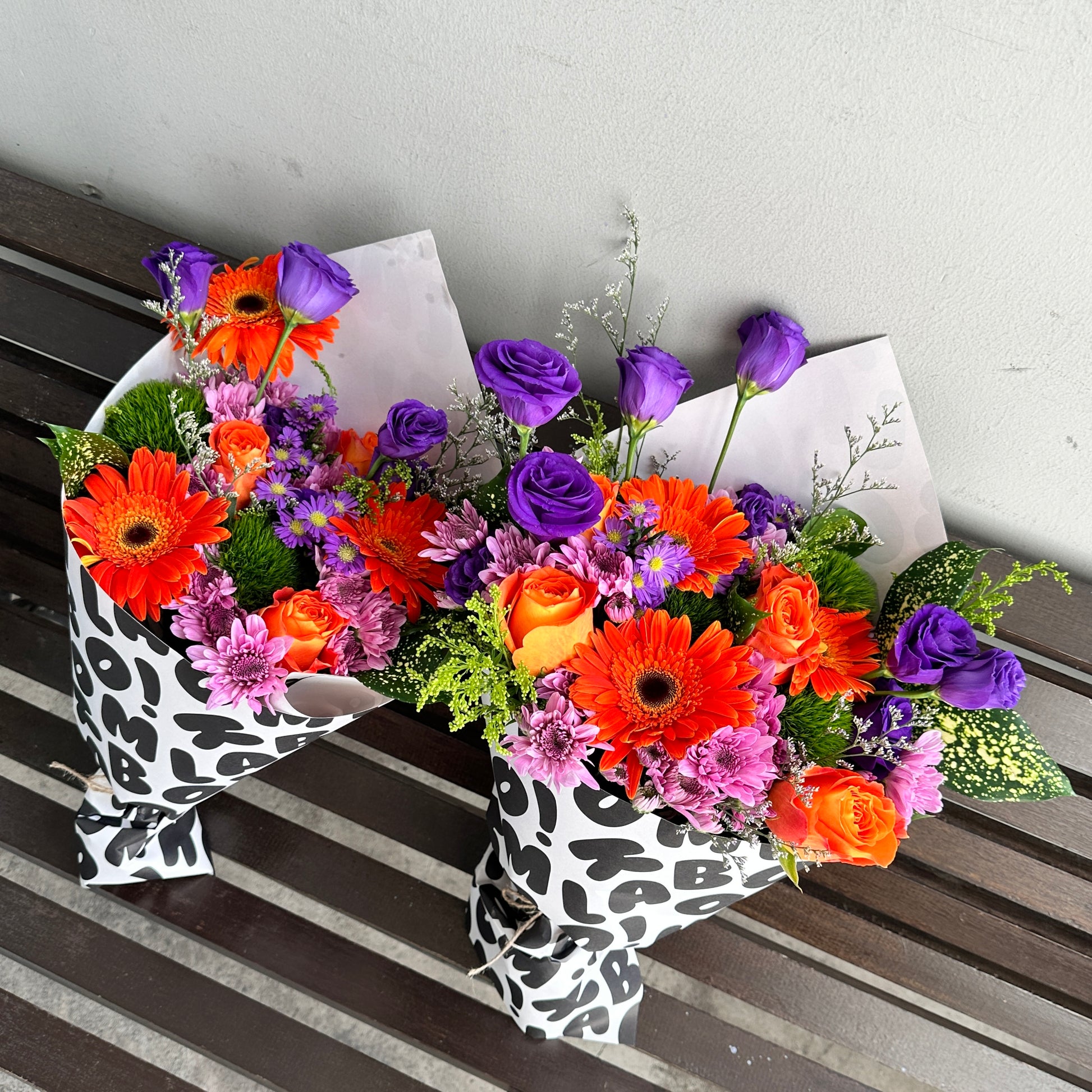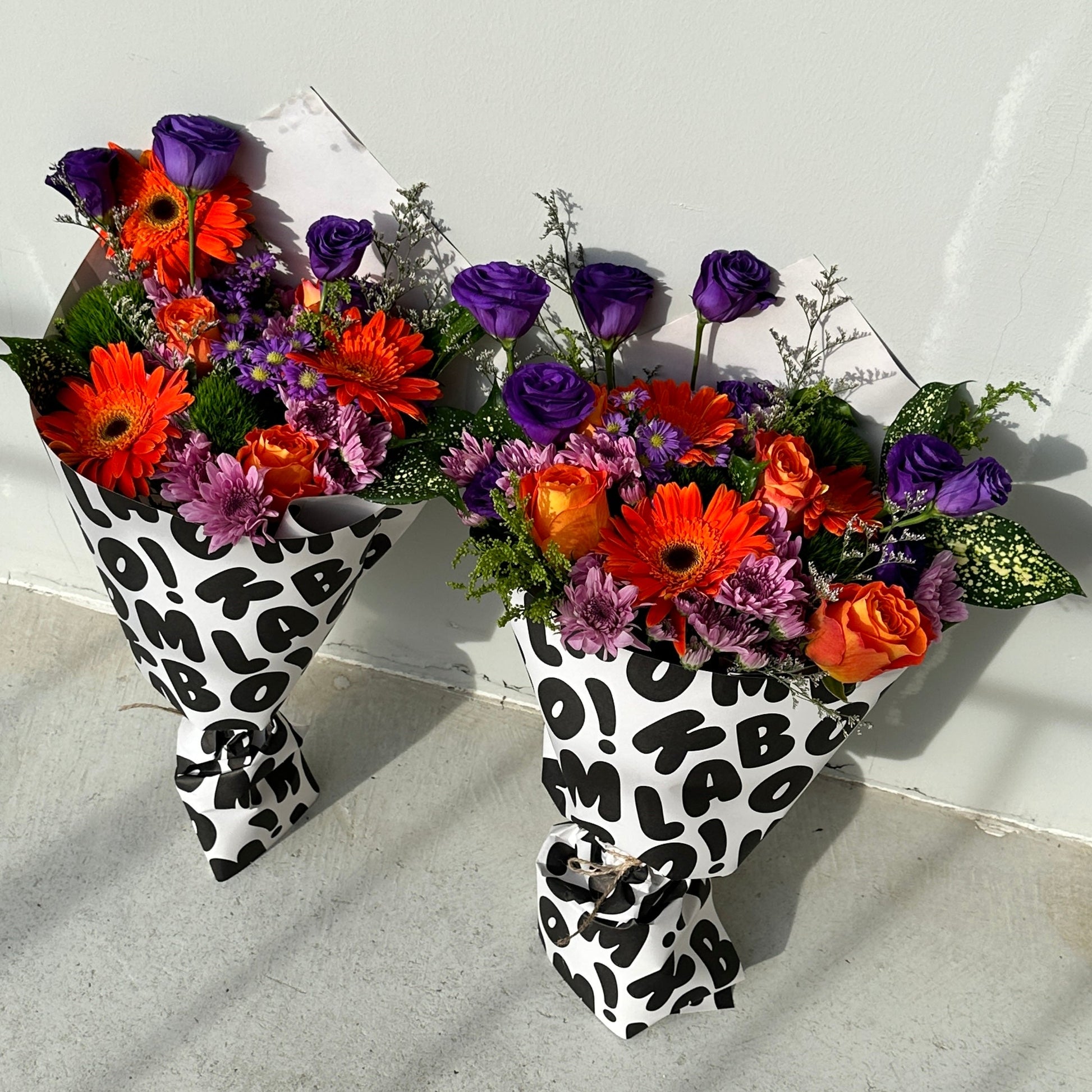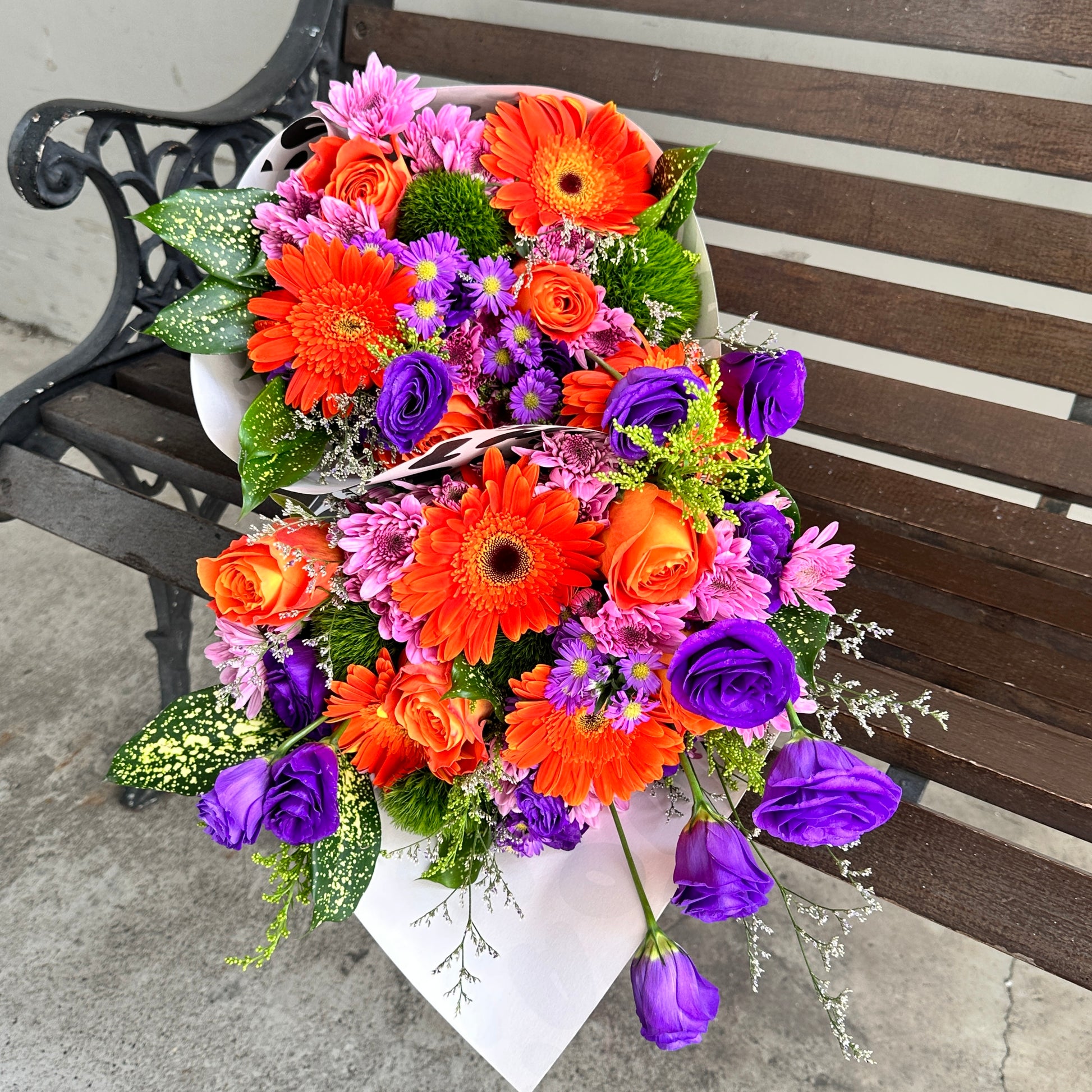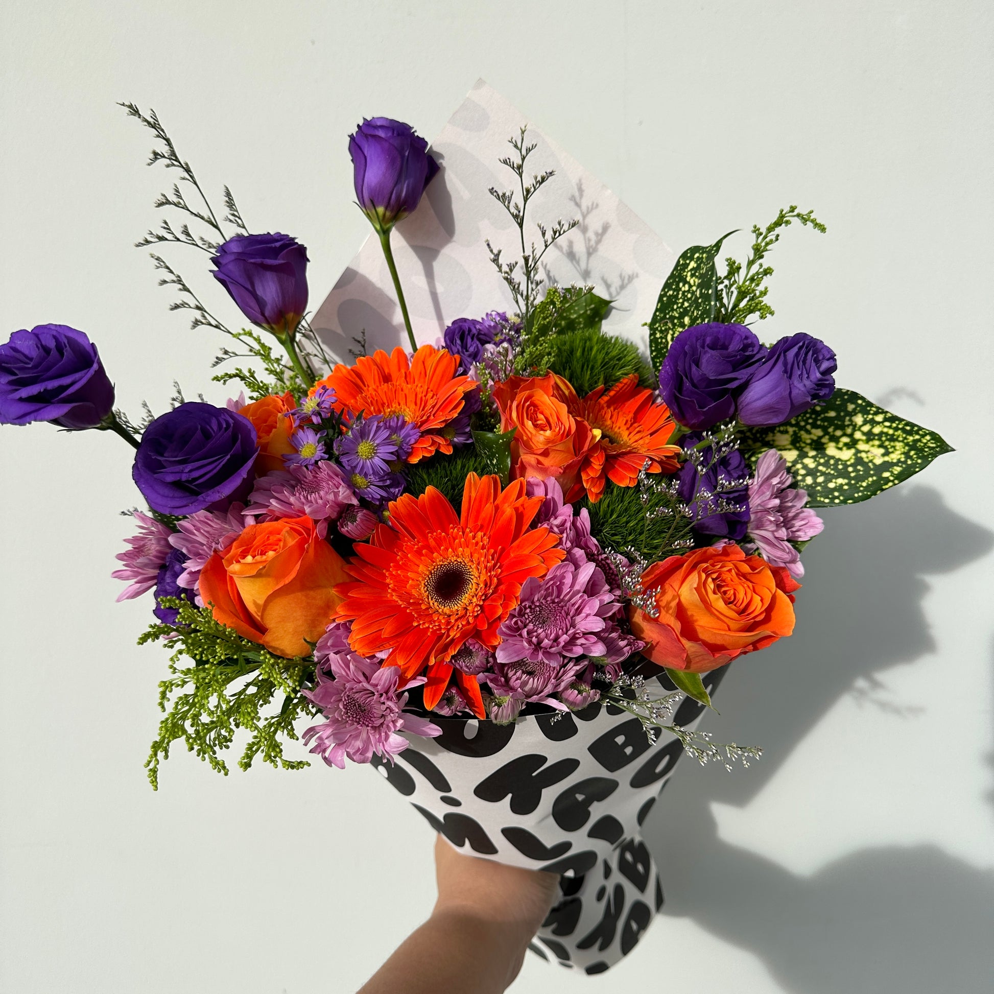 KB ISSUE #54 - For the ones who love colour, confidence, and a little bit of chaos -- this arrangement brings together vibrant orange gerberas, purple eustomas, orange roses, and a curated mix of blooms in sunset-bright orange and royal purple tones.