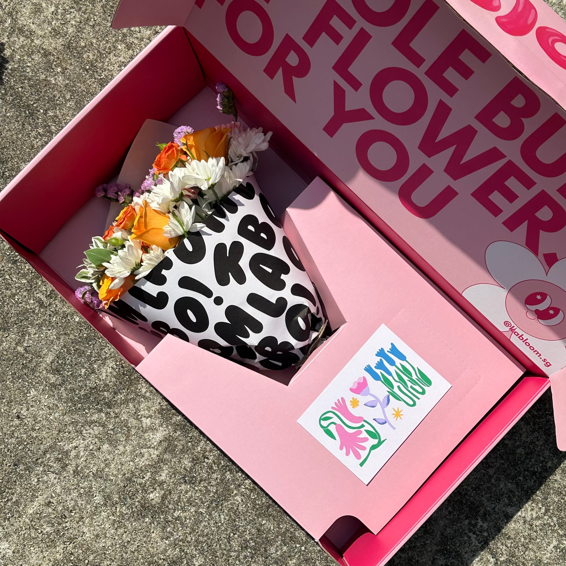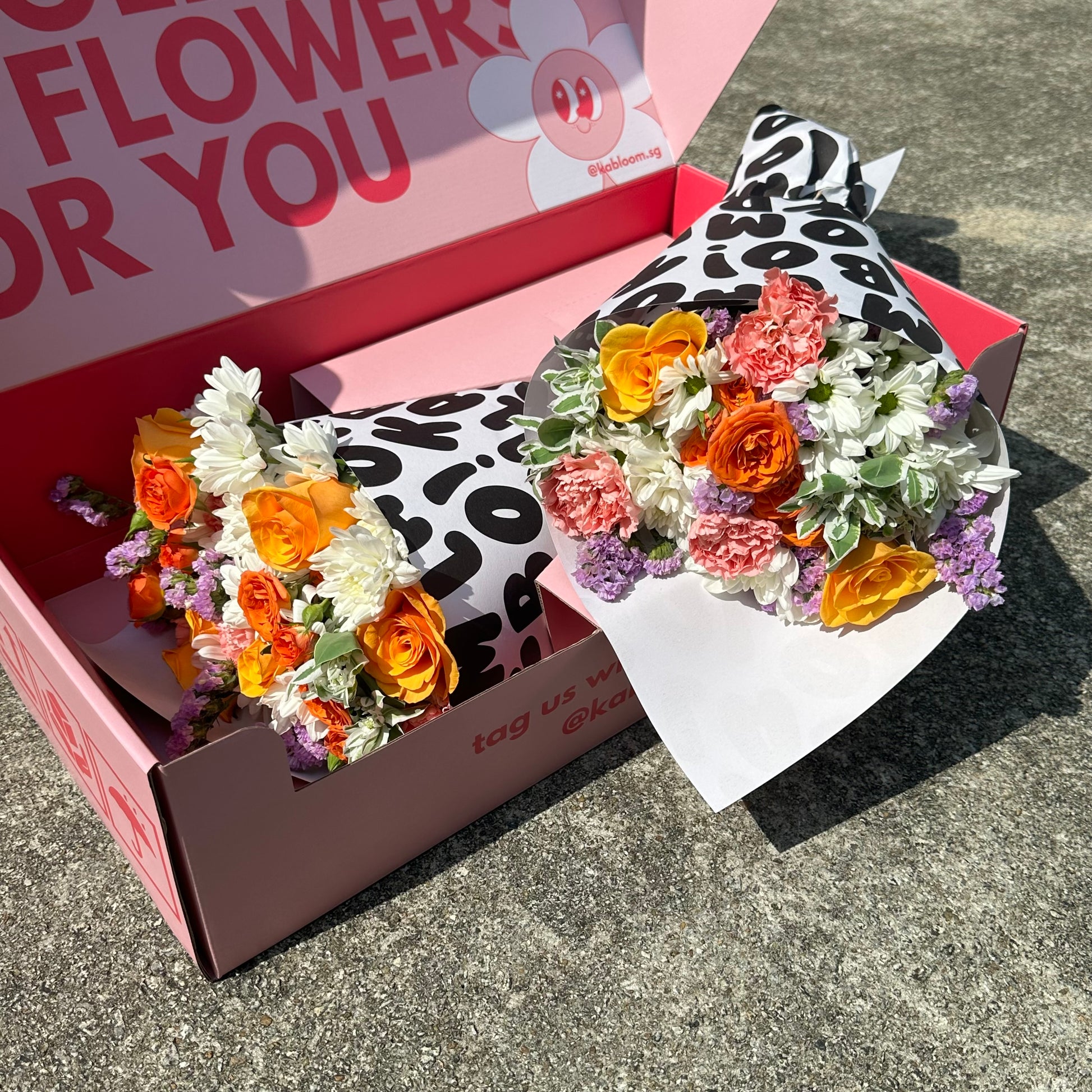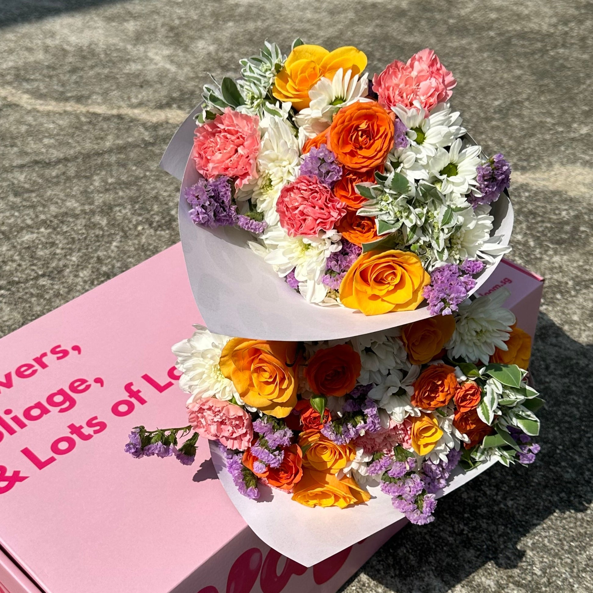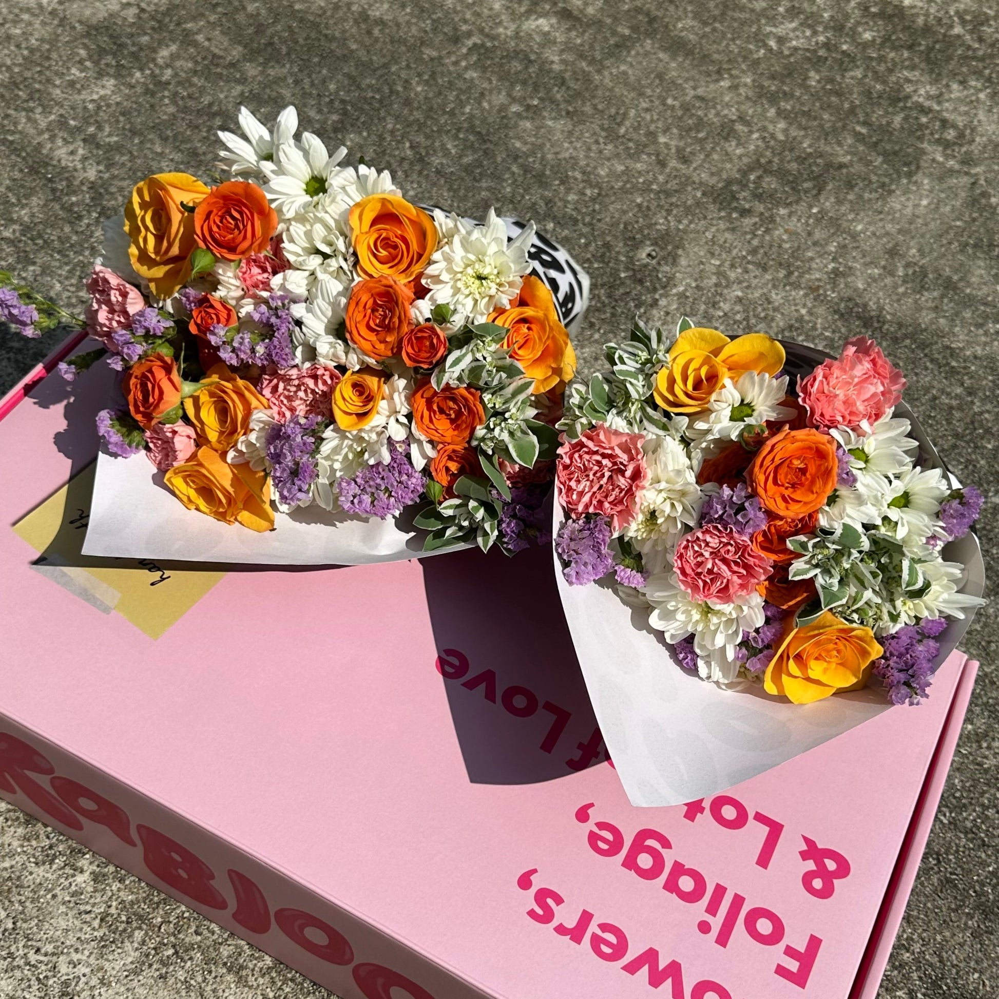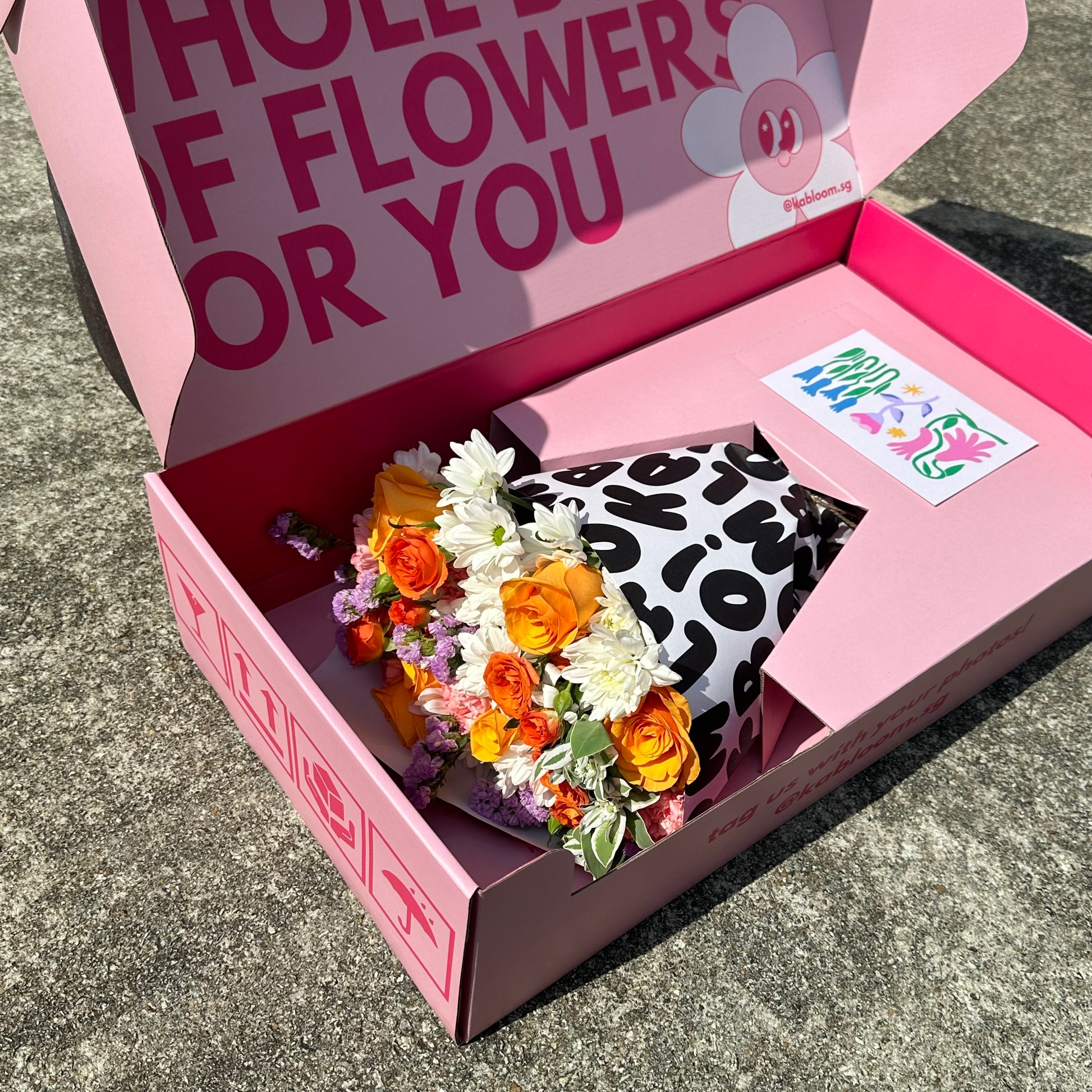 All bouquets will be delivered in our Kabloom boxes, to you or your recipient's doorstep. Each bouquet will also come with a complimentary gift card, please remember to leave your note (and delivery date) before you check out!