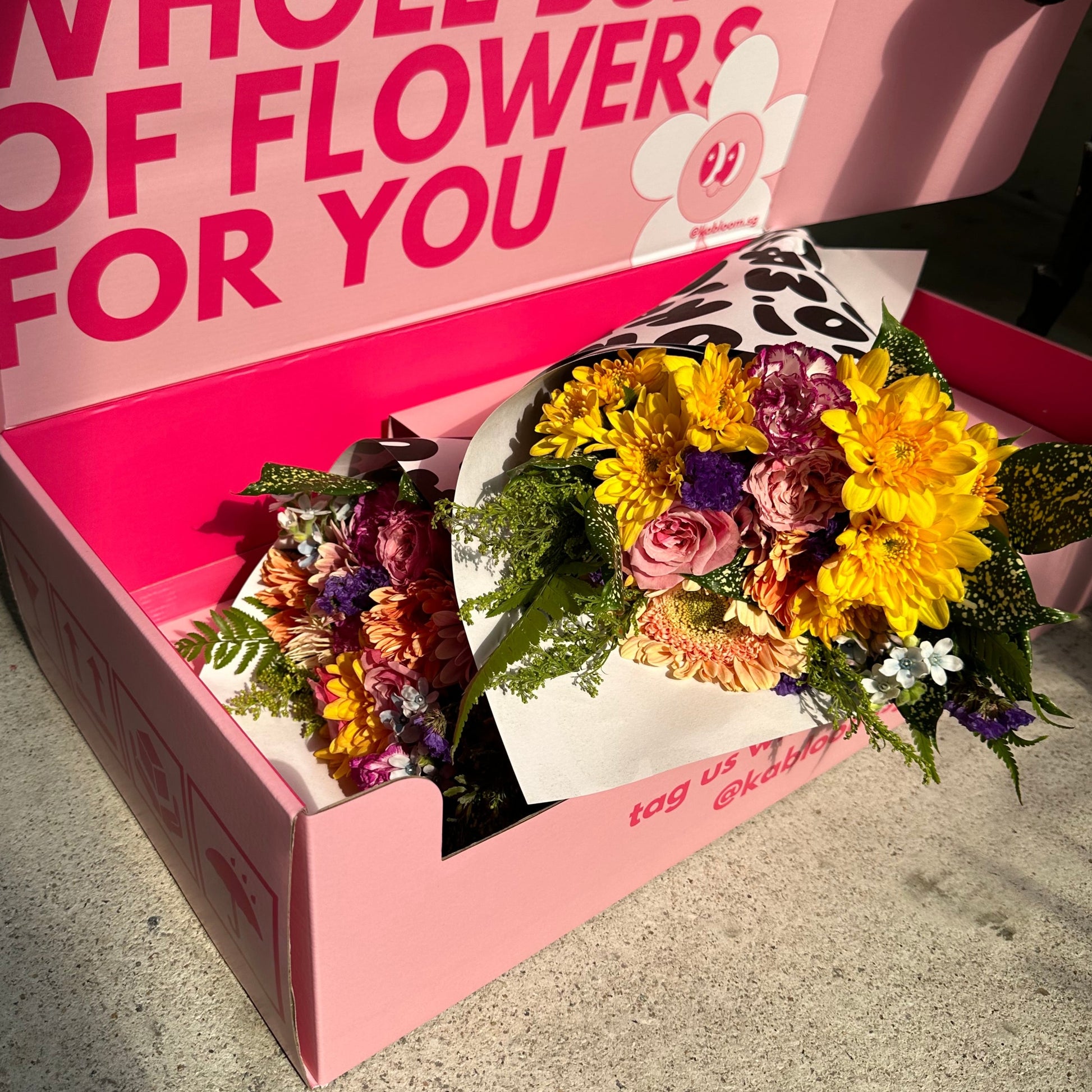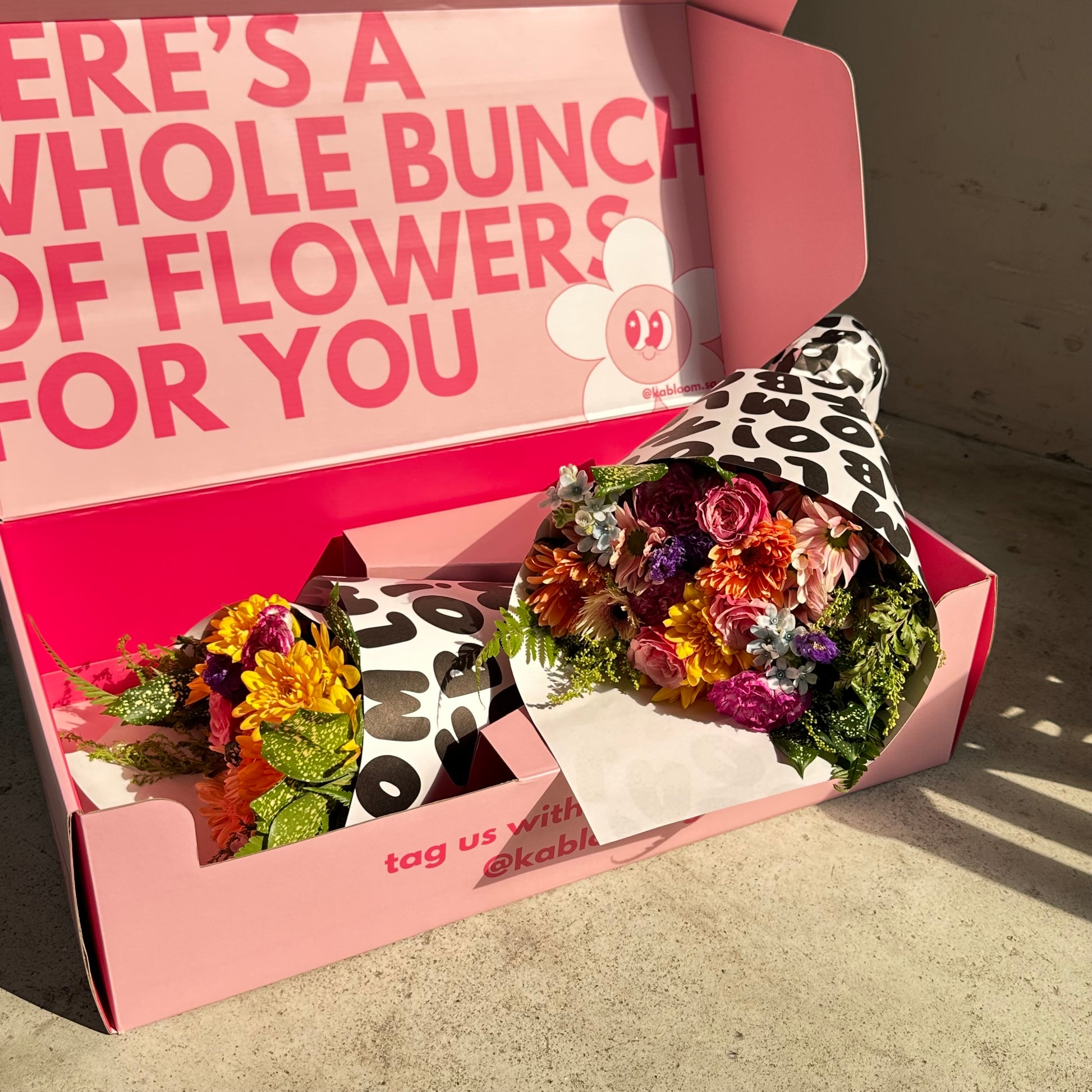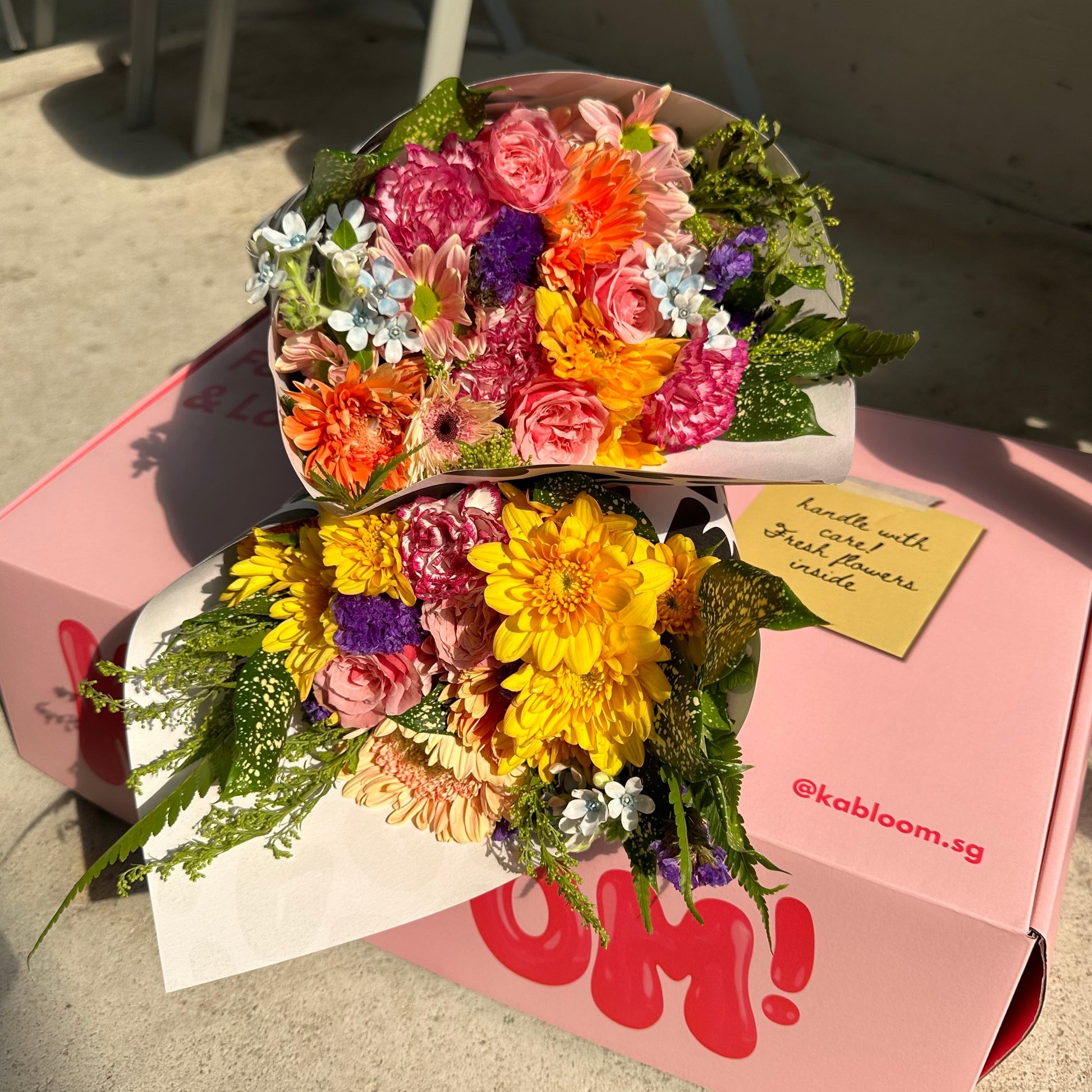 All bouquets will be delivered in our Kabloom boxes, to you or your recipient's doorstep. Each bouquet will also come with a complimentary gift card, please remember to leave your note (and delivery date) before you check out!